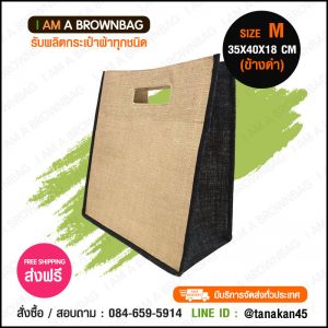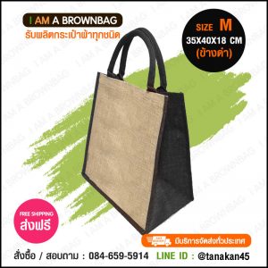 กระเป๋าผ้ากระสอบ แบบหูกลม (ไซส์ M ข้างน้ำตาล) ขนาด 35 x 40 x 18 cm